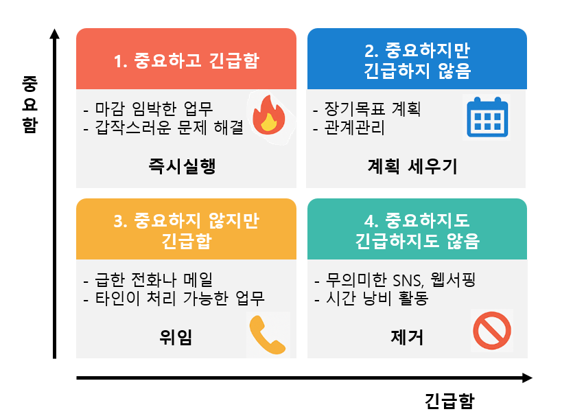 ‘아이젠하워 매트릭스(Eisenhower Matrix)’와 같은 도구를 활용해 우선순위를 정리해 보세요.