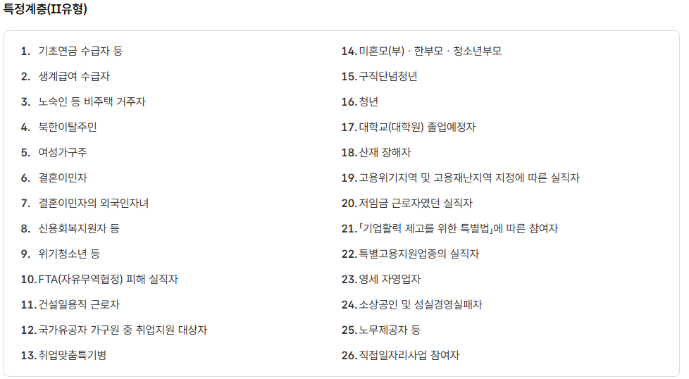 국민취업지원제도의 주요 대상은 '취업취약계층'으로, 이는 일할 능력과 의사가 있음에도 불구하고 취업에 어려움을 겪는 국민을 의미합니다. 구체적으로는 저소득 구직자, 청년, 경력단절여성, 장기실업자, 특수형태근로종사자 등이 해당되는데, 고용24 에서 제공하고 있는 유형별 세부 조건은 아래와 같습니다.