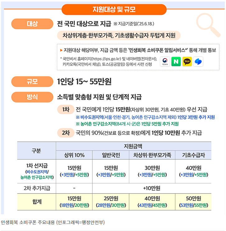 정부에서 국민들의 소비를 돕고 경제 활성화를 위해 '민생회복 소비쿠폰'을 지급합니다.