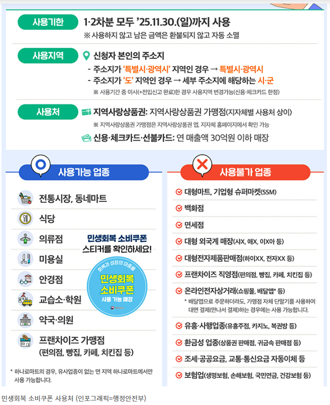 - 사용처: 주소지가 속한 지방자치단체의 소상공인 매장에서만 사용할 수 있습니다. 아쉽게도 대형마트 같은 일부 업종은 제한되니 주의하세요!