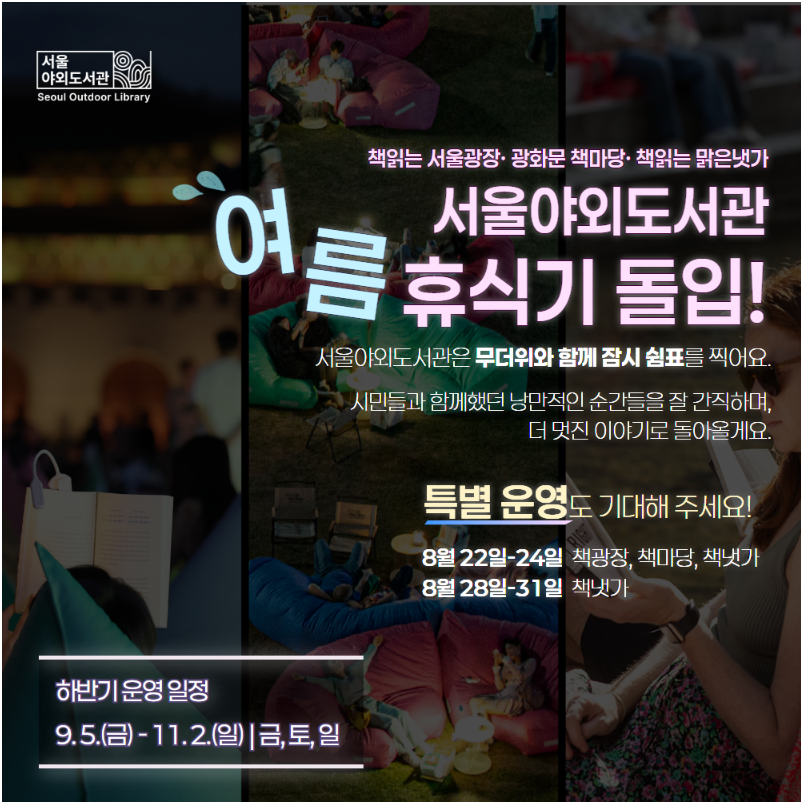 서울광장, 광화문광장, 청계천 등 세 곳에 설치되는 야외 독서 공간입니다. 도심 한복판 야외에 책 읽는 공간과 산책로를 꾸며, 도심 속 밤낮으로 독서 축제를 펼치고 있습니다. 현재는 날씨로 인한 여름 휴식기 중인데, 8월 22일(금)부터 24일(일)까지 주말 3일간 오후 4시부터 10시까지 열린 후, 청계천 장소는 8월 28~31일에도 연장 운영됩니다. 그림책·교양서 등 2천여 권의 도서가 비치되고, 북 콘서트·낭독회·어린이 공연 등 다양한 문화행사가 곁들여집니다.