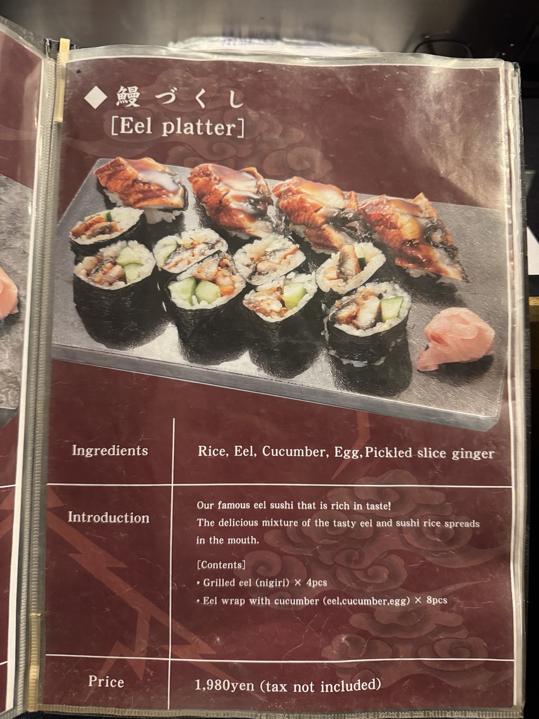 처음에는 1,980엔짜리 모둠초밥을 생각하고 들어갔는데, 옆에 있던 젊은 한국인들이 주문하는 장어플래터도 괜찮아보여