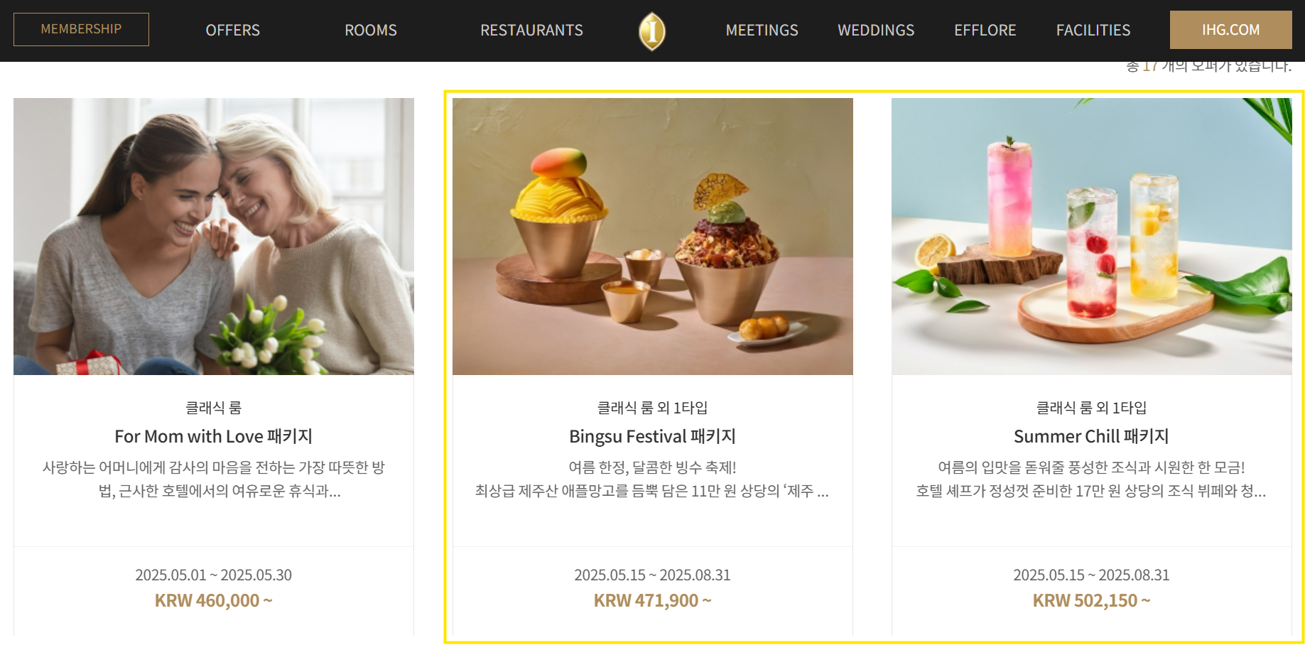 | 그랜드 인터컨티넨탈 서울 파르나스 | Bingsu Festival | 2025.05.15 ~ 2025.08.31 | 471,900 ~ | 객실 (클래식 룸 외 1타입), 제주 애플망고/시그니처 쑥 빙수, 커피 2잔 |