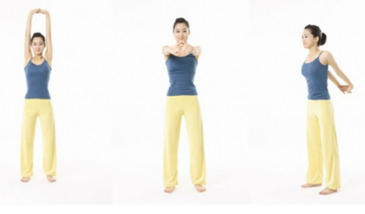그 다음 깍지 낀 두팔을 앞으로 뻗어서 5초 정도 유지합니다.. 마자막으로 양손을 등 뒤에서 잡고 팔을 천천히 들어 올려 가슴과 어깨 앞쪽 근육을 늘려줍니다. 어깨를 뒤로 젖히고 가슴을 활짝 펴는 느낌으로 진행합니다.