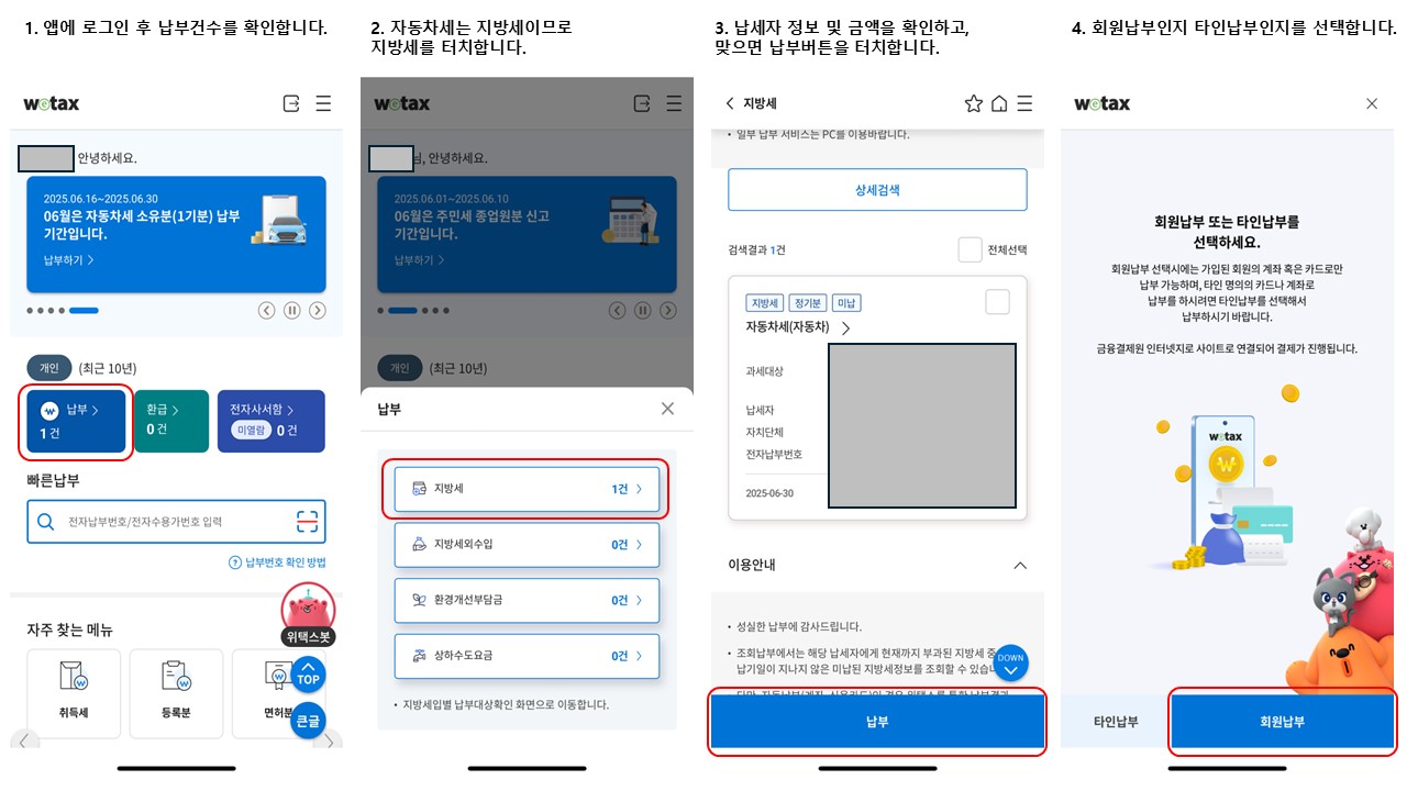 - 스마트 위택스/STAX 앱: 스마트폰에 각 앱을 다운로드하여 언제 어디서든 간편하게 자동차세를 납부할 수 있습니다. 납부 절차는 일반적으로 세목 선택, 납부할 세금 조회, 납부 버튼 선택, 납부 확인 순으로 진행됩니다.