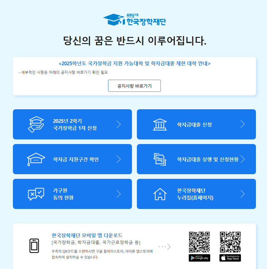 - 한국장학재단 홈페이지 접속 또는 모바일 앱 설치: