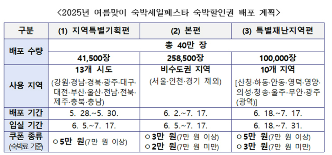 국내여행이 본격화 되는 시점을 대비하여 문화체육관광부와 한국관광공사는 국내 관광을 활성화하고 지역 경제에 활력을 불어넣기 위해 '2025 대한민국 여름맞이 숙박세일페스타'를 진행합니다. 아무래도 시즌이니 만큼 여행관련 정보가 많아지네요.