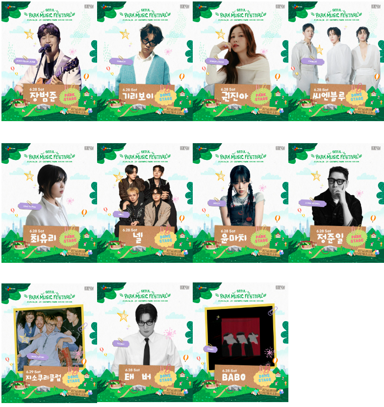 - PARK STAGE (88잔디마당): 독보적인 록 사운드와 폭발적인 에너지의 자우림, 서정적인 감성과 탄탄한 음악성을 자랑하는 폴킴, 카더가든, 홍이삭, 그리고 여름 햇살과 어울리는 따뜻한 인디 사운드의 나상현씨밴드, 스텔라장, 김수영이 잔디마당을 수놓습니다.